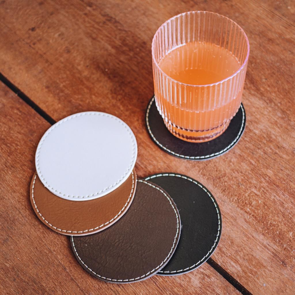 Porta copo feito em material sintético similar ao couro e acabamento em pesponto.